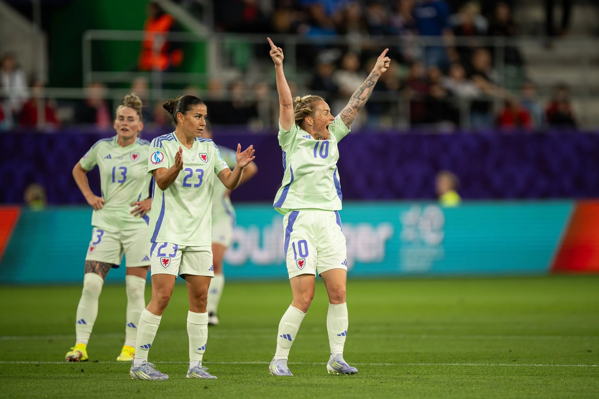 Wales Women’s player Jess Fishlock celebrates with her arms raised during the UEFA Women’s EURO 2025. Beside her, Ffion Morgan claps in support, while in the background Rachel Rowe stands with her hands on her hips. All three players are wearing Wales’ mint-green away kit with marine-blue detailing